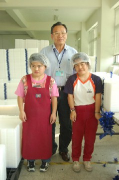 「我們本來只能在回收場撿別人不要的東西回家,現在每月領近4萬元,可以買喜歡的東西了」。台中縣大雅鄉一對侏儒姊妹花邱美鳳、邱美秀,自去年12月到華煜科技上班,本來1家5口被列低收入戶,現在生活改善,感謝公司經理鍾鍊達是「大恩人」。 鍾鍊達謙虛地表示,這本來就是企業的社會責任及良知,公司除聘任兩姊妹外,另還僱用3名身心障礙者,他相信只要給他們機會,他們也能表現得和別人一樣好。目前邱美鳳、邱美秀負責無塵面板去塑膠包裝工作,公司規定的數量,她們每天都準時完成,不輸給其他同仁。 30歲的邱美鳳、28歲邱美秀以不「輪轉」的國語,表達對公司的感恩。她們說,父親是老榮民,今年83歲了,母親53歲,患有侏儒症,她們三姊妹也都有侏儒症,最小妹妹還無法自理生活,需要媽媽全天陪伴。 邱姓姊妹的父親從軍中退役後原本在梨山務農,因年老體衰,田地又被公家收回,全家只好搬到大雅鄉一處資源回收場旁,姊妹每天都到回收場撿拾可用的東西回家。被鄉公所列低收入戶。 鍾鍊達說,他在台中市日商東日光學公司服務30年,該公司一直以來都會進用身障者,94年他到華煜科技,引進這套用人制度,向當地里長及豐原就業服務站表達雇用殘障者的意願。去年11月兩姊妹來應徵,經訓練2周後,發現2人不僅肯學,更是用心負責,因此決定錄用。 |